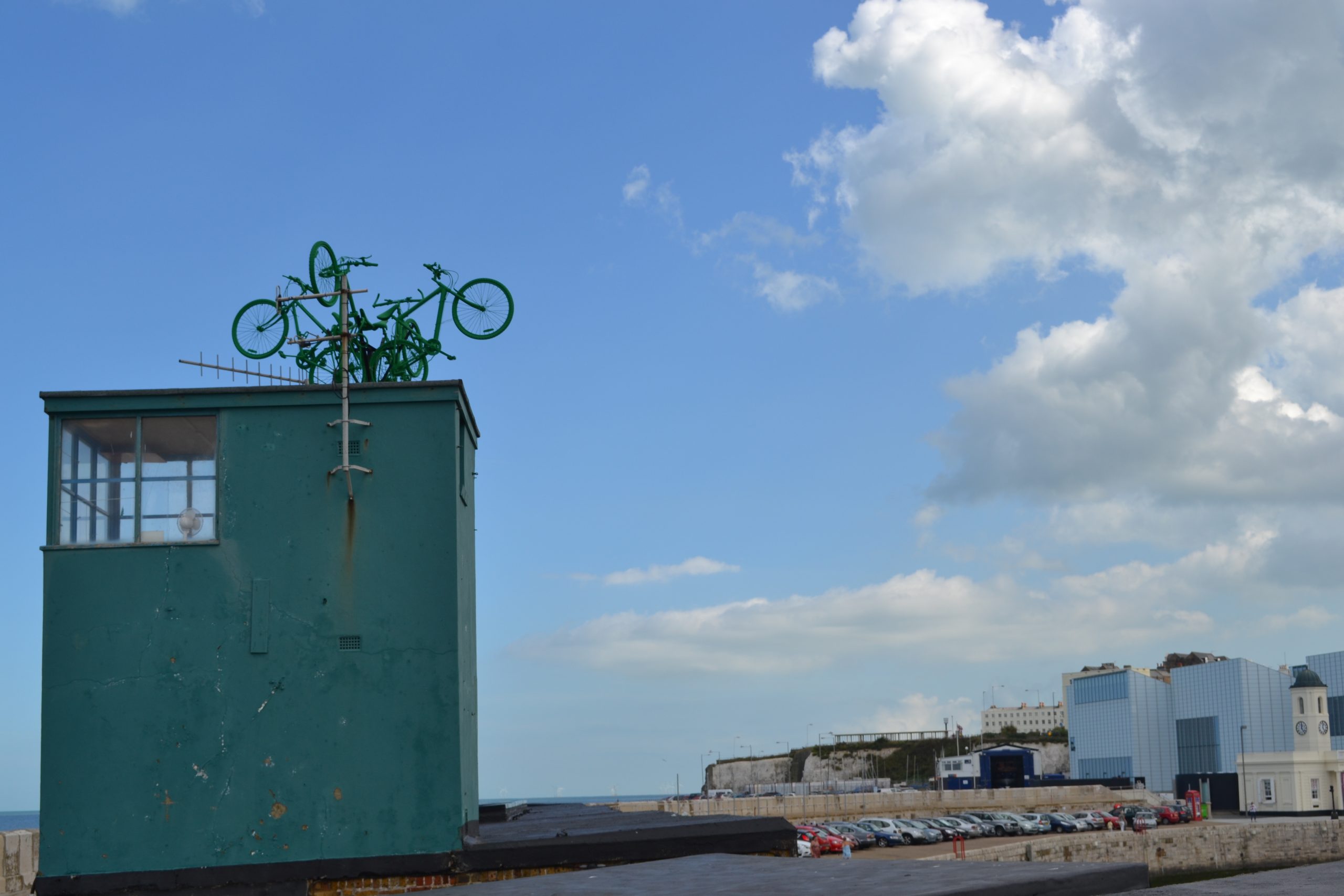 Four green painted bikes, point towards the horizon facing the four cardinal points of the compass. The installation echoes Margate’s maritime history, facing outward to the world, in celebration of cycling across the globe.