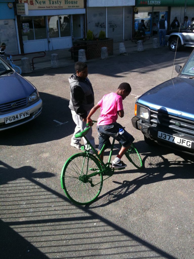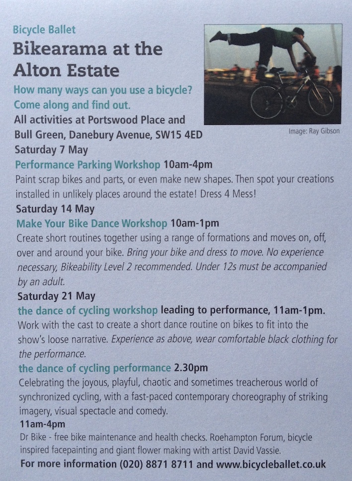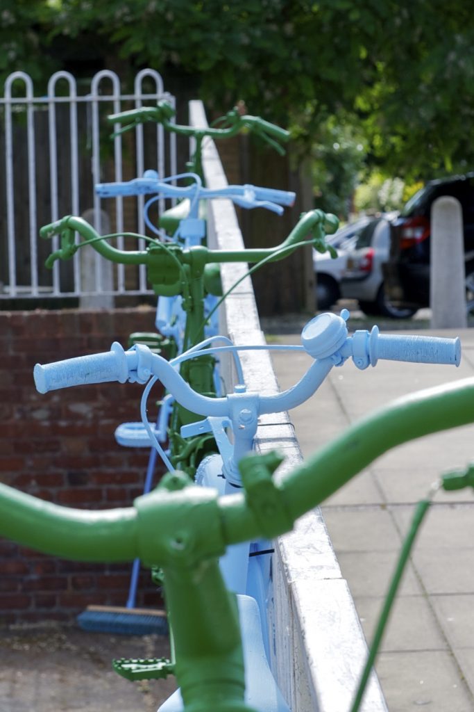In 2011, Wandsworth Arts Festival approached Creative Producer, Karen Poley, to run a project on the Alton Estate in Roehampton. A number of bikes were painted and installed around the estate as part of a Bicycle Ballet workshop and performance project, during the festival.