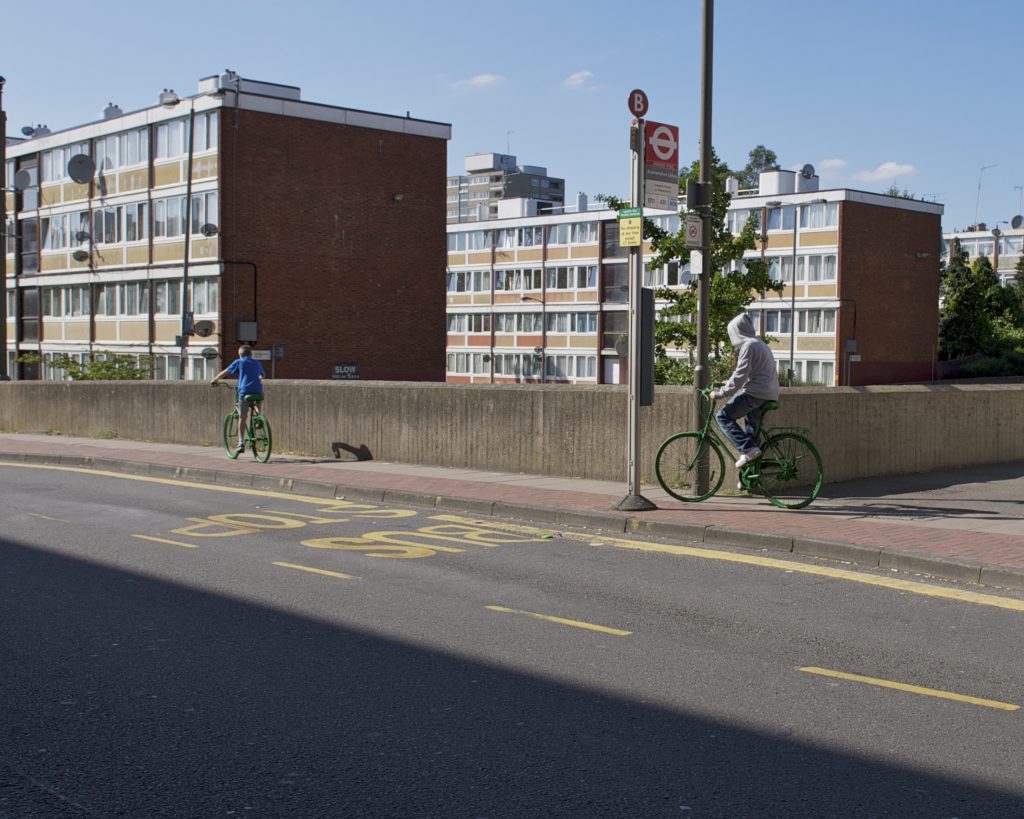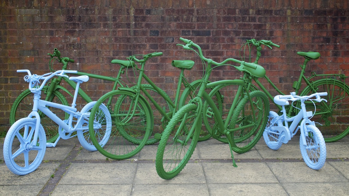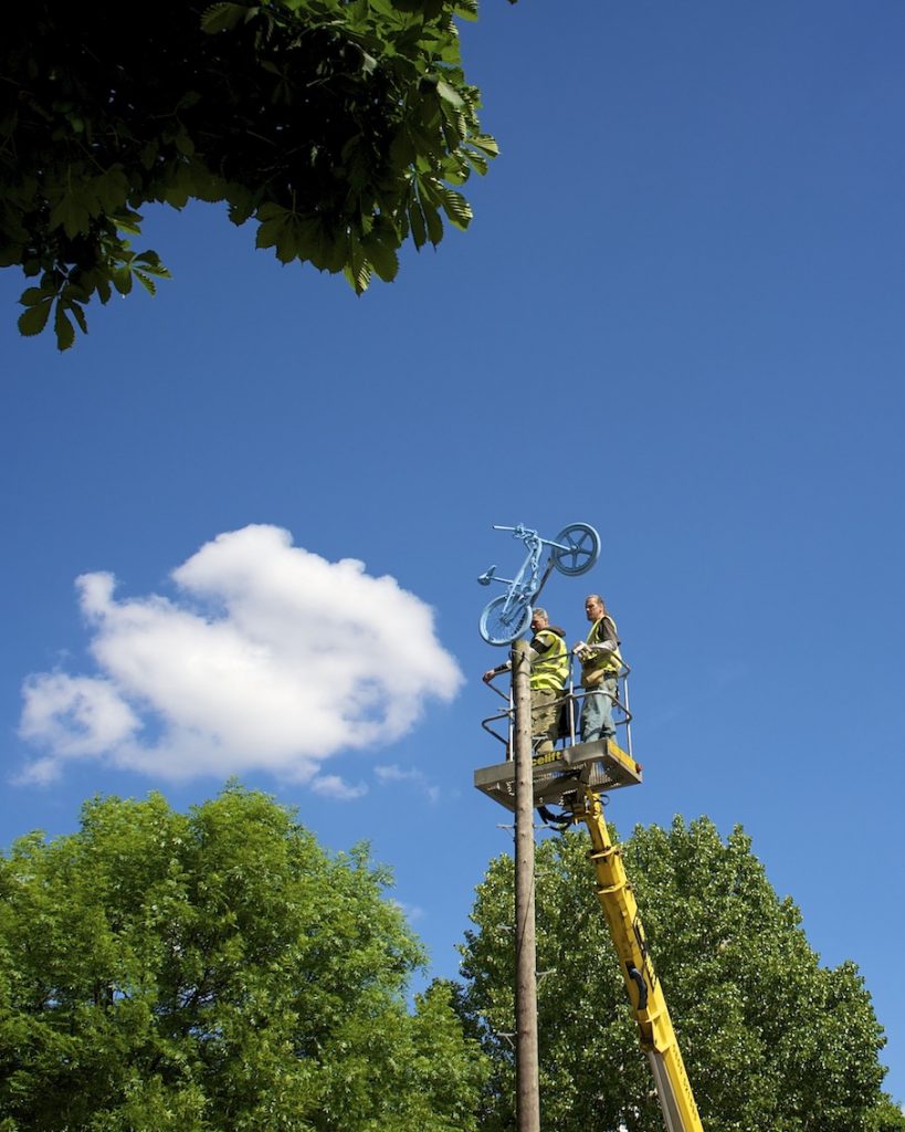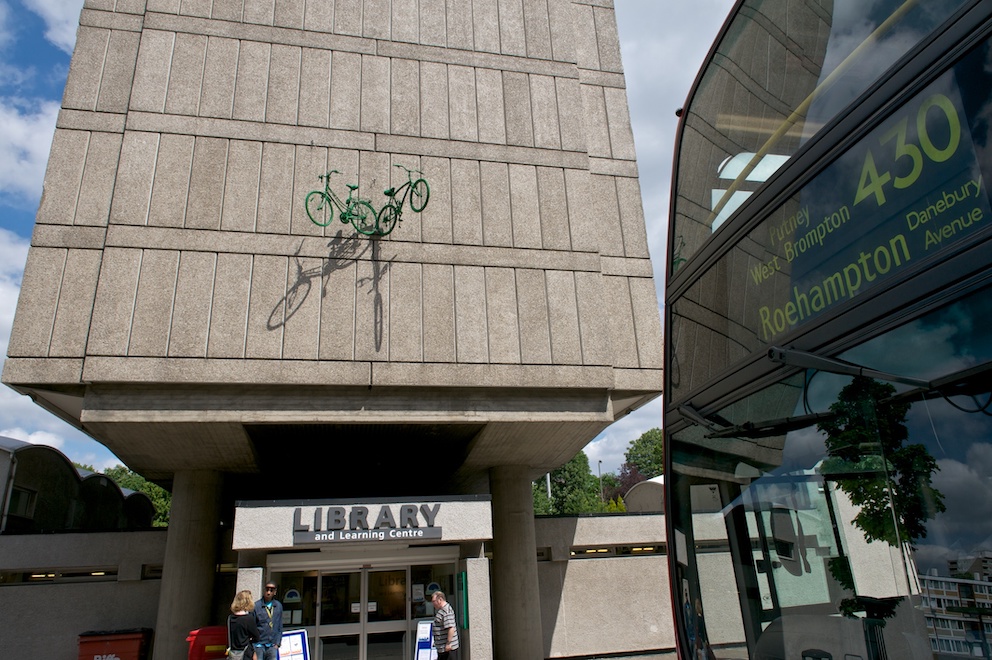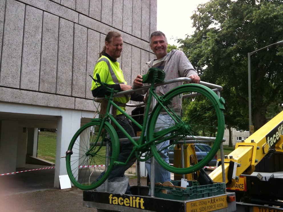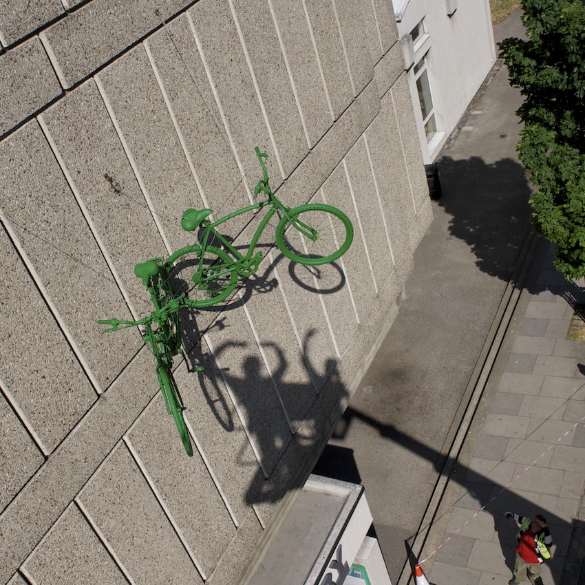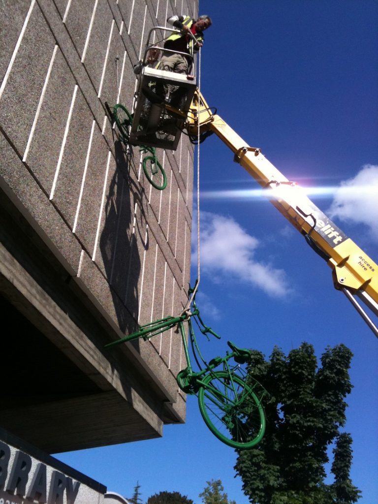 Watching the bikes being installed above Roehampton Library, a local resident came up laughing that the installations reminded him of a saying in his country, Romania, ‘Green Horses on the Wall.’ When you see green horses on the wall, you’re dreaming of incredible or impossible ideas, as in ‘a pipe dream’ or ‘when pigs might fly.’