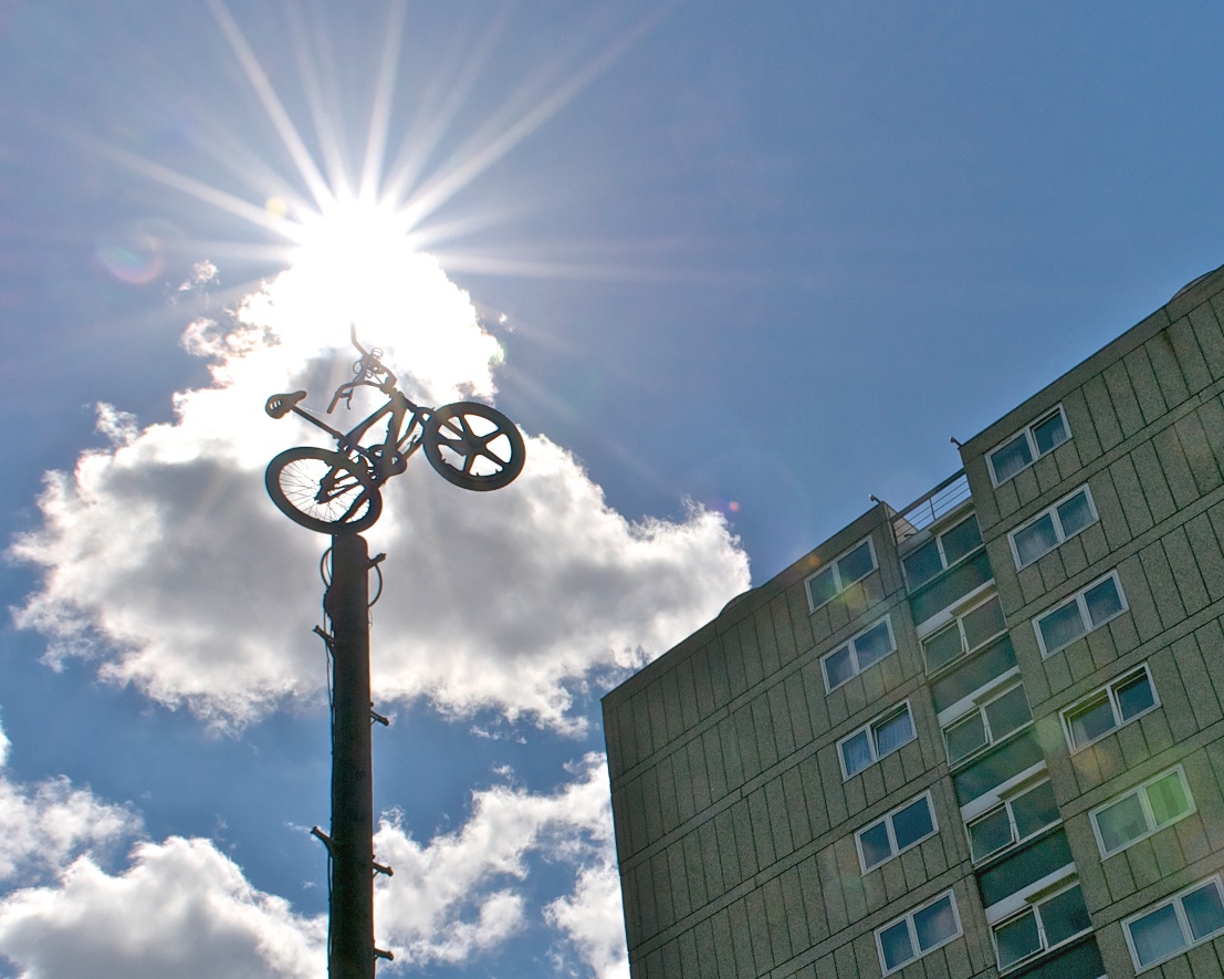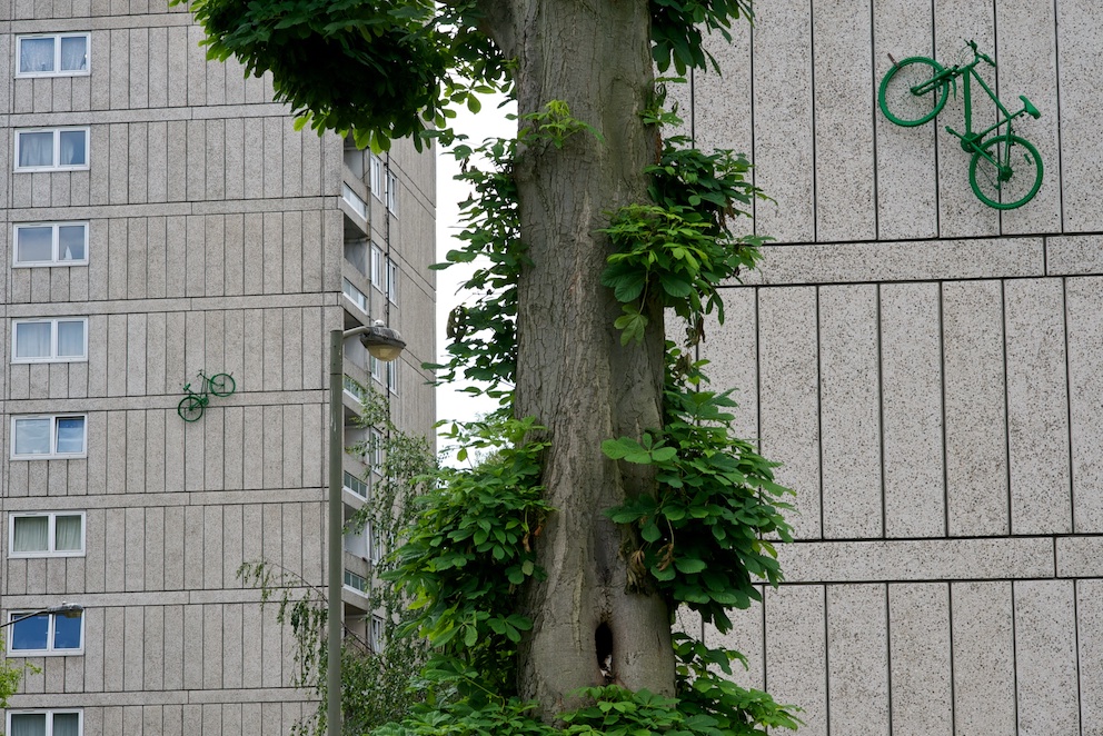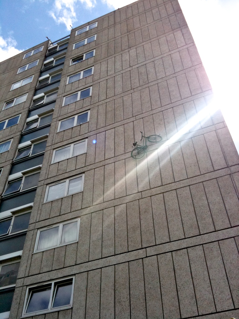 As the bike below was installed on the side of one of blocks of flats, a woman in a block across leaned out of her window & asked “What are you doing?” “Parking my bike!’came the answer!”
